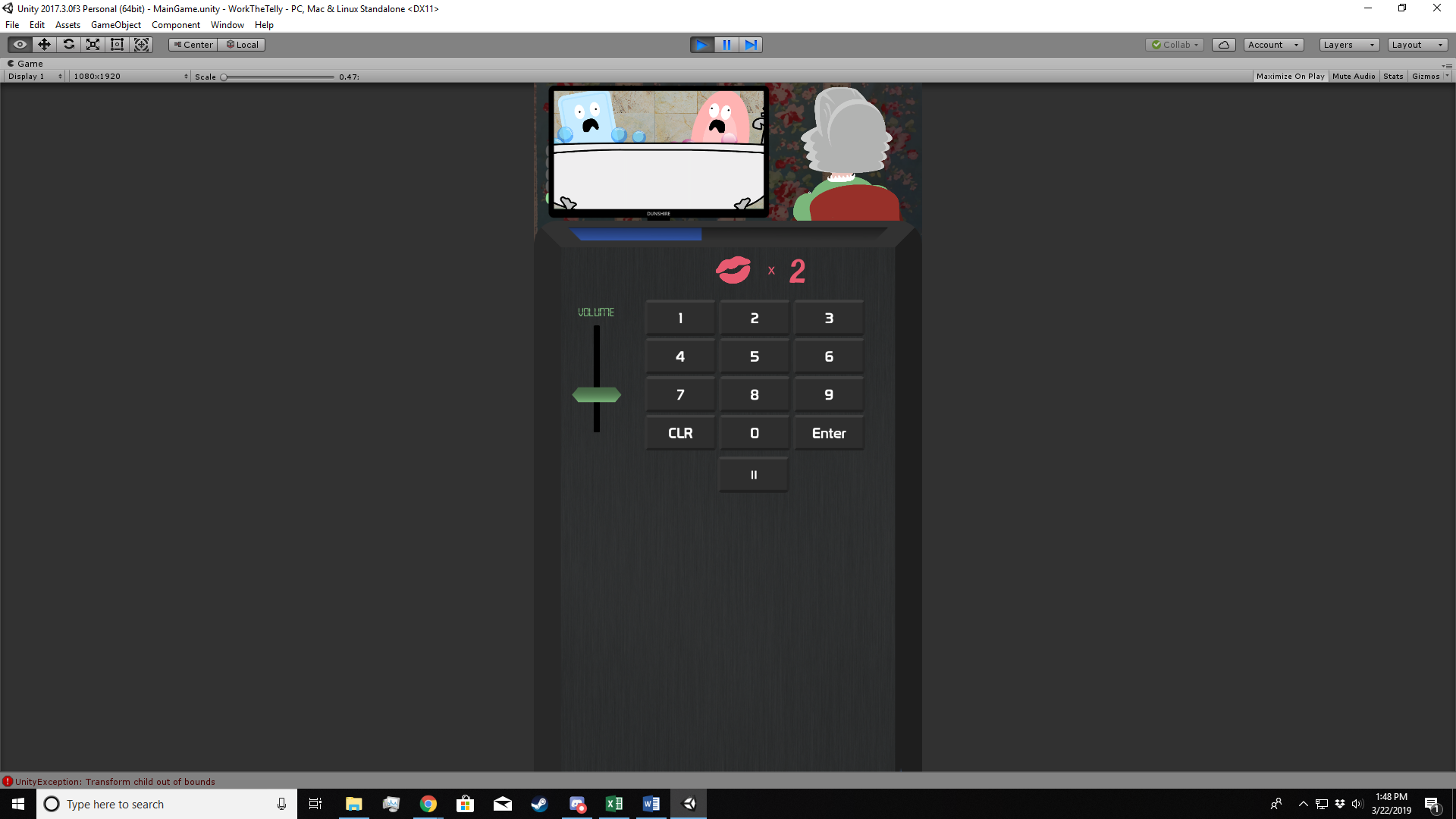 Work the Telly is a simple, play till you lose game. It has 3 different things you need to complete before your grandmother’s patience runs thin. The speed ramps up every 4 completed actions. It helped a lot with learning how to use Unity’s UI functions.